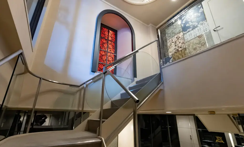 2階へ上がると、上質な照明と透明感のあるガラスが織りなすラグジュアリーな空間。