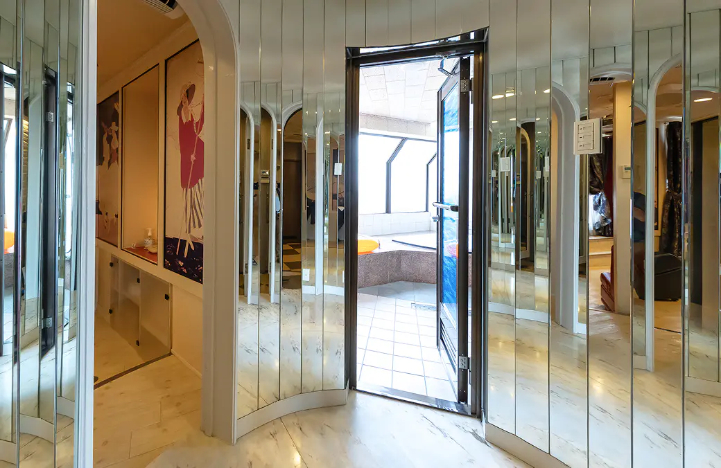 昼は明るく開放的に、夜は照明がきらめき幻想的な雰囲気に変わります。デザイン性と非日常感を兼ね備えた、印象的なひと部屋です。
