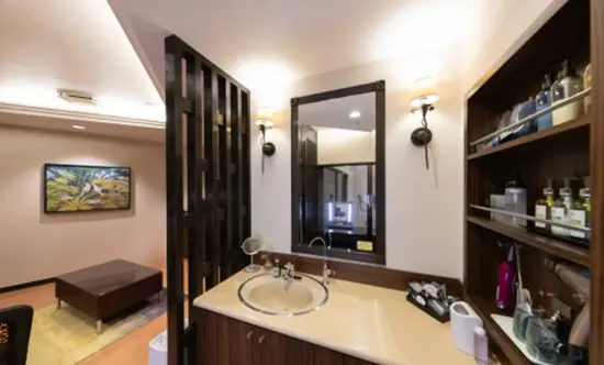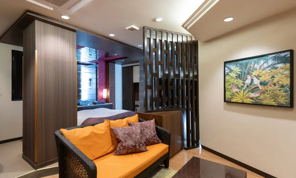 ラタン調のソファや間接照明が、南国の夜を思わせる穏やかな雰囲気をつくり出します。非日常を感じながらも、どこか“自分の部屋のように落ち着く”バランスの取れた空間です。