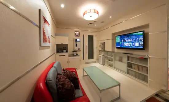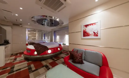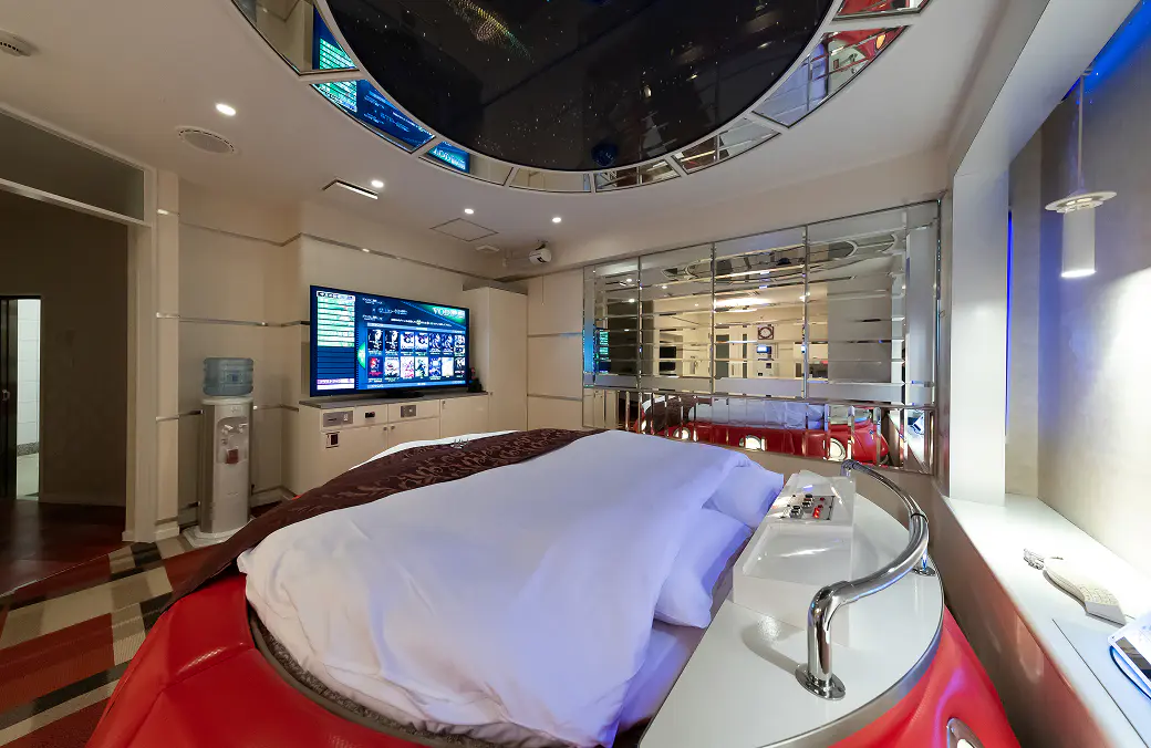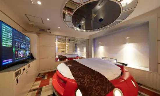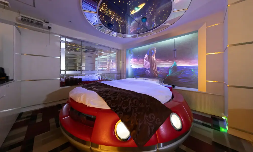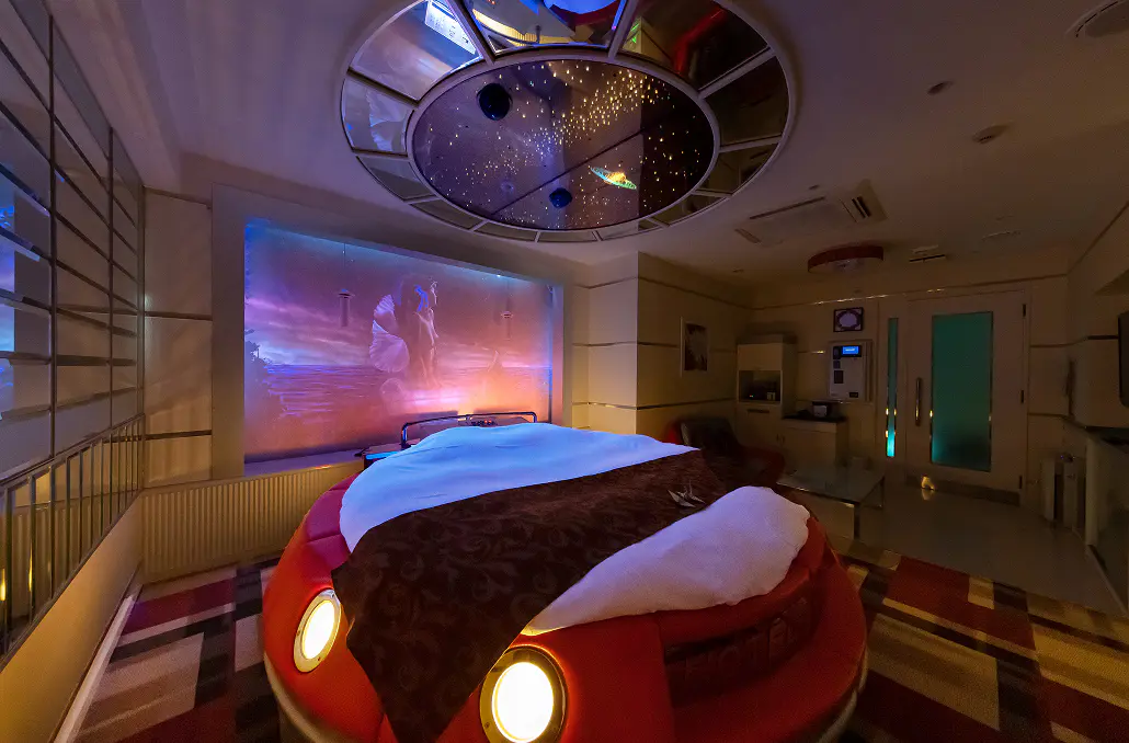 赤い丸型のベッドに、天井いっぱいの惑星と星々。照明を落とすと、まるで宇宙空間を航行しているような幻想的な世界に包まれます。
