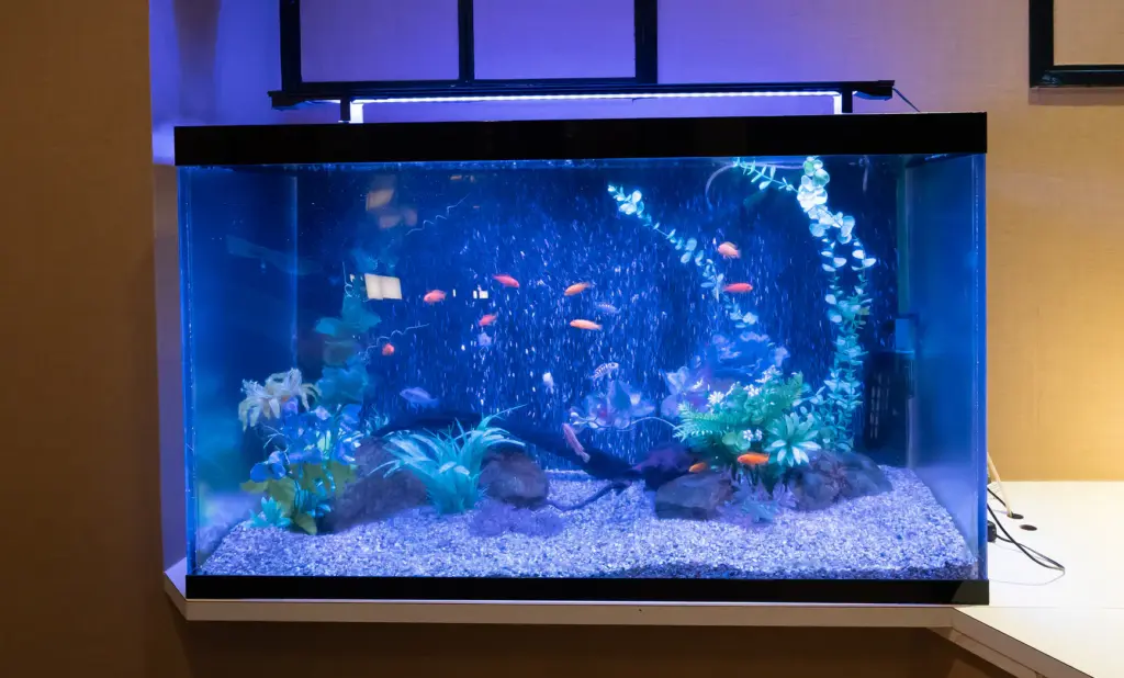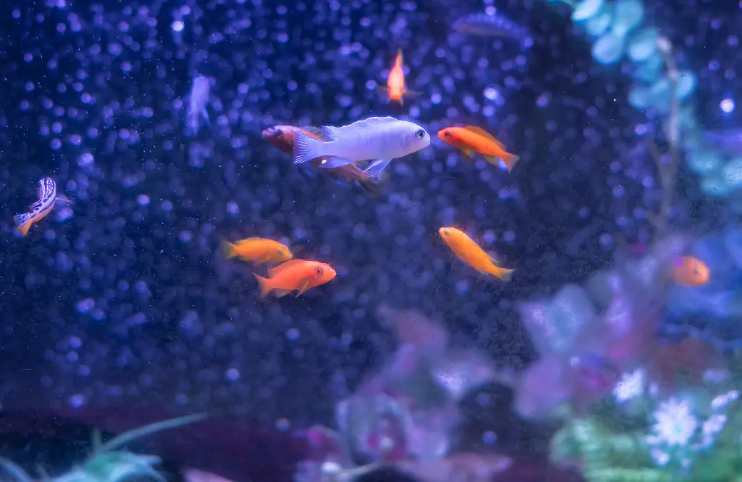 色とりどりの熱帯魚が泳ぐ水槽が、穏やかな時間を演出。水のきらめきと照明の光が重なり合い、まるでアートのような癒しの空間に。